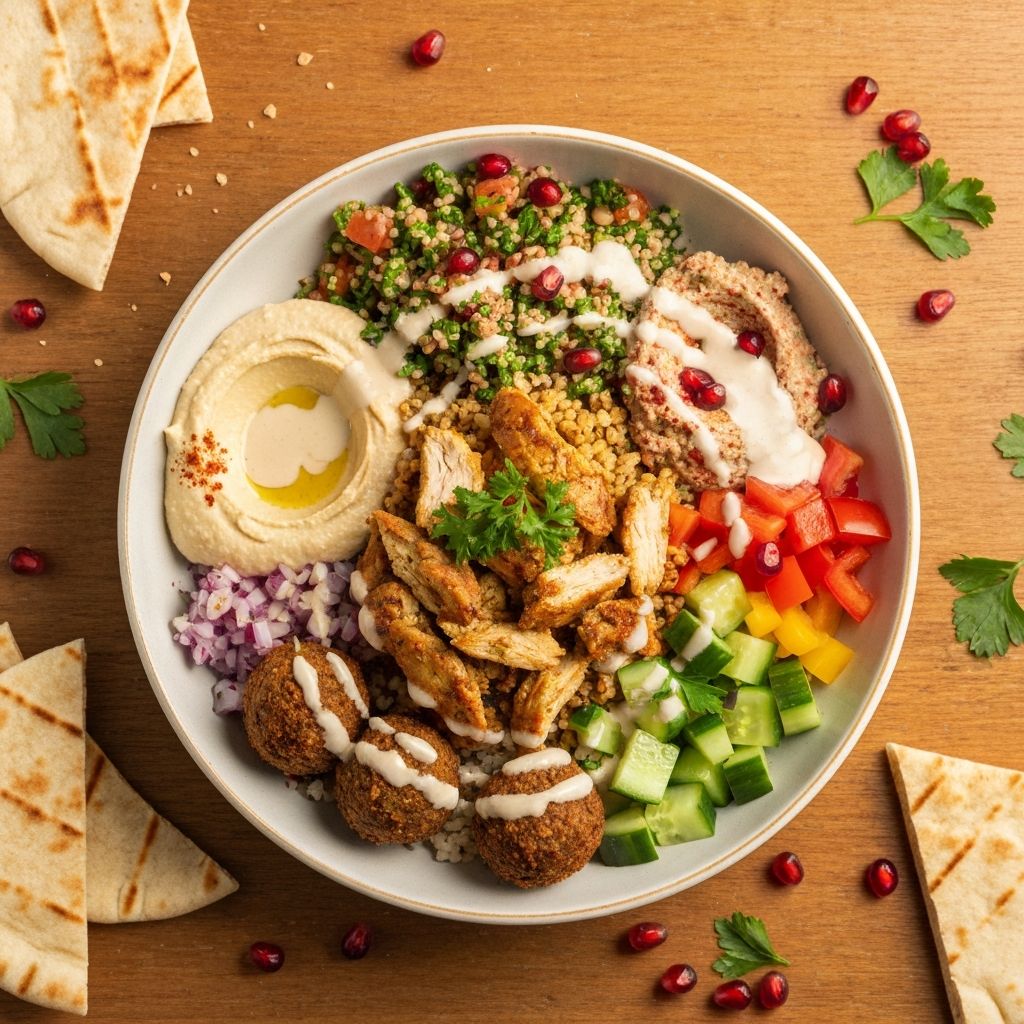 Our Mezeh nutrition calculator helps you track the nutritional content of your Mediterranean meal. Browse by category or search for specific items. Build your own bowl by selecting a base, protein, toppings, and sauces to see the complete nutritional breakdown.